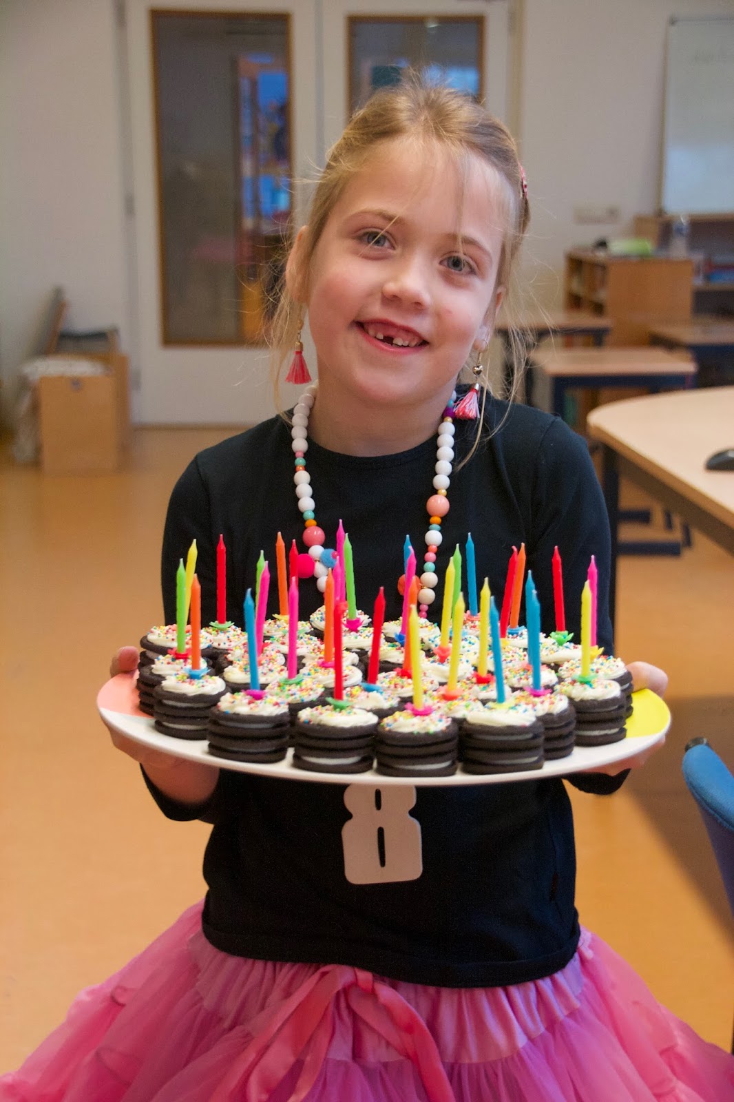 Voordat dochterlief naar school ging, kreeg ze lieve berichtjes van familie en vrienden. Hierna moest ze echt naar school. Op het schoolplein werd ze warm onthaald door haar vriendinnetjes. Kleine Pluis en ik gingen terug naar huis om de traktatie af te maken, omdat we na een uurtje weer terug naar school moesten om bij het feestje te zijn. Dochterlief is dol op chocolade en Oreokoekjes zijn favoriet. De keuze voor de traktatie was dan al snel gemaakt. Het werden kleine taartjes van Oreokoekjes.